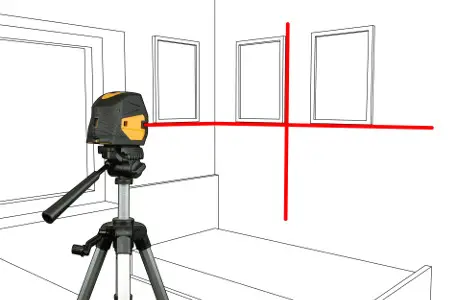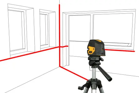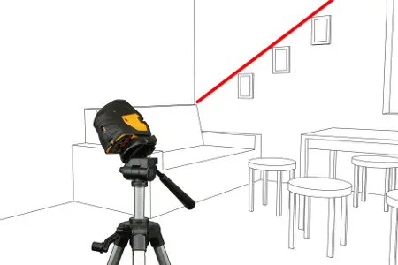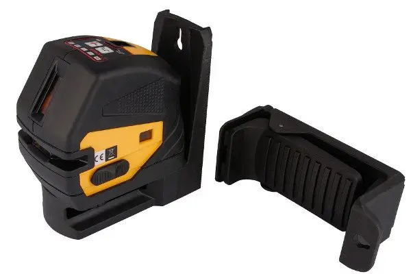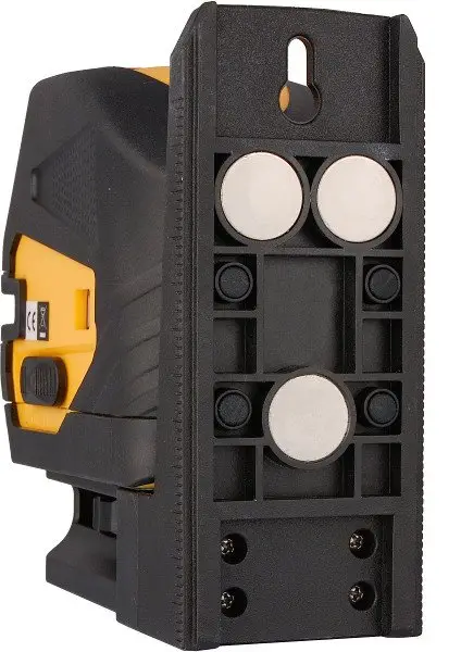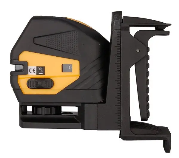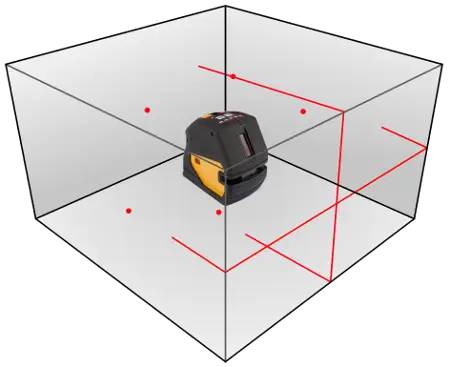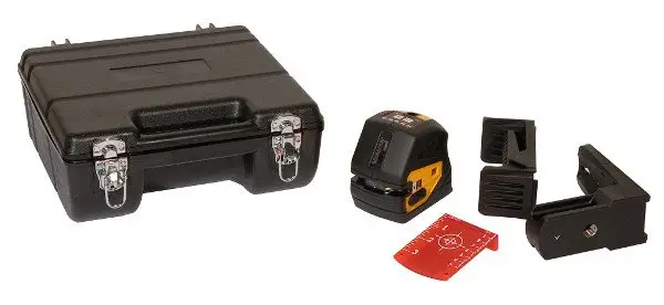 Laser auto nivelant émettant cinq points laser perpendiculaires entre eux et de deux lignes lasers (une horizontale et une verticale) se croisant en angle droit. Fonctions d’aplomb. Support multifonctionnel équipé de puissants aimants et de deux pas de vis (1/4” et 5/8” pour trépieds), pince de fixation sur rail et emplacement pour fixation par vis ou pointe.