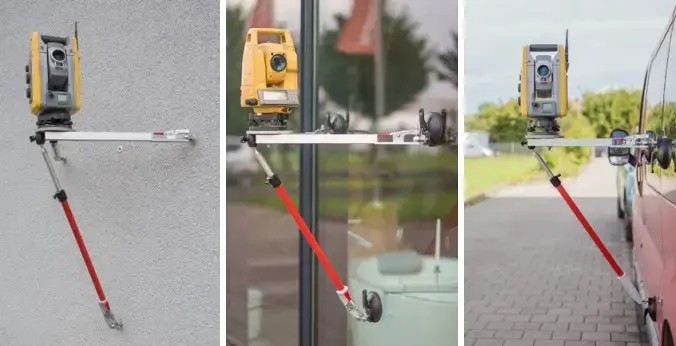 La fixation à 3 points en liaison avec les adaptateurs à bille M8 permet l’utilisation du trépied non seulement sur les murs, mais également sur les bâtiments, les équipements, les conteneurs, les tours, les véhicules, etc.